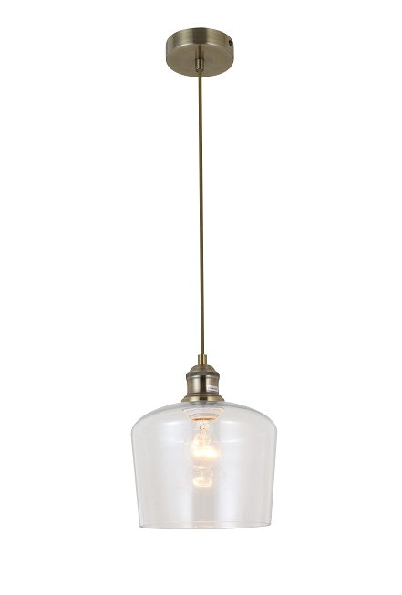 Single pendant in an antique brass finish with a clear glass shade with a gold cable. Takes 1 x E27 bulb. Ideal for a hallway or landing. Simple elegant style which will help will blend in with many interior designs.